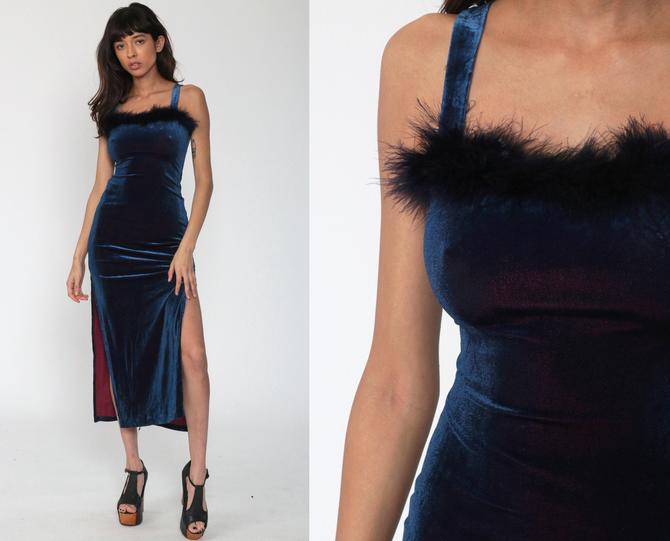 Blue Velvet Dress 90s Feather Trim High Slit Maxi Party Vamp Forever 21 Y2k Vintage 90s Bodycon Dress Cocktail Spaghetti Strap Small Xs S By Shopexile From Shop Exile Of Los Angeles