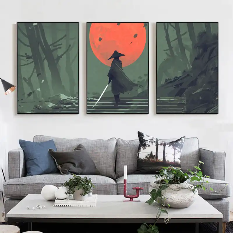 Pintura em tela japonesa samurai, em pé, escada, floresta com lua vermelha, imagens de parede para sala, arte de parede, tela|Pintura e Caligrafia| - AliExpress
